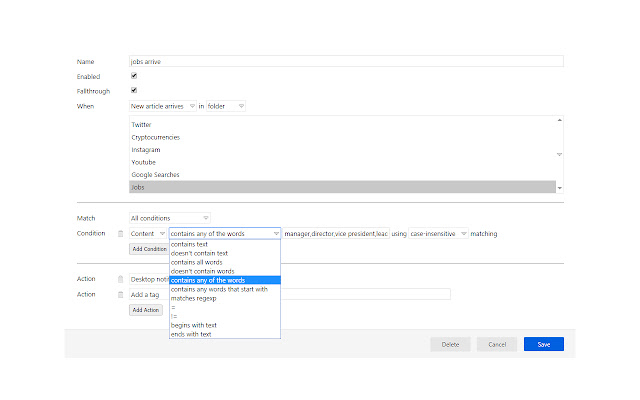 - 内置规则引擎可让您定义过滤、边框突出显示、自动书签、标记、隐藏和正则表达式突出显示文章的规则。规则还支持 Chrome 弹出通知和声音效果。