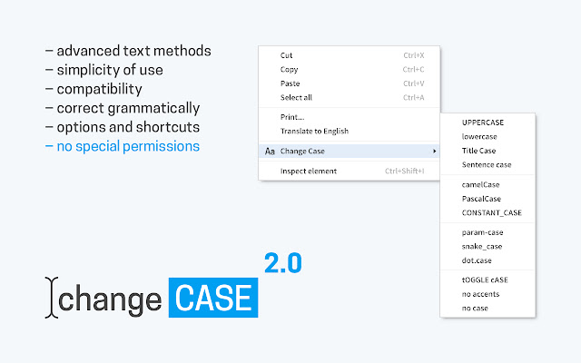 一组更改文本大小写的高级方法,作为浏览器 Google Chrome 的便捷扩展程序提供。与网站的各种元素兼容:输入、文本区域、可编辑内容(流行的文本编辑器,如 TinyMCE)。