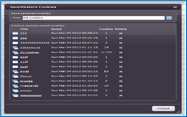 显示所有 Google Chrome cookie 的列表。允许搜索、查看、编辑、保存、恢复和删除 cookie。