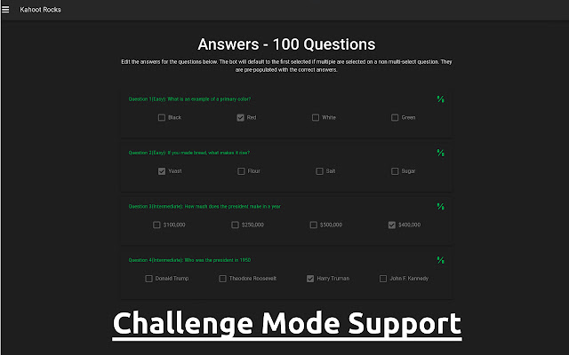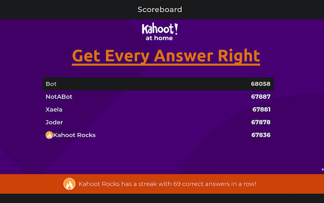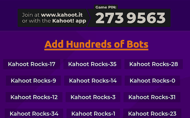 官方Kahoot! Rocks chrome 扩展程序一劳永逸地修复了可怕的加载错误!在任何 Kahoot!(甚至挑战模式)中获得正确的所有答案。新的保密功能允许您随机化答案延迟并更改正确答案的机会以避免怀疑。欢迎支持服务器与版主帮助您解决 https://rocks.network/discord 上出现的任何问题。使用内置的 Botter 轻松进行机器人游戏,可在几秒钟内添加多达 255 个机器人。避免使用随机机器人名称进行检测,从而无法将您链接回机器人。使用全新的挑战模式功能轻松完成挑战,在几秒钟内完成巨大的挑战,同时获得 99.9% 的最大可能分数。