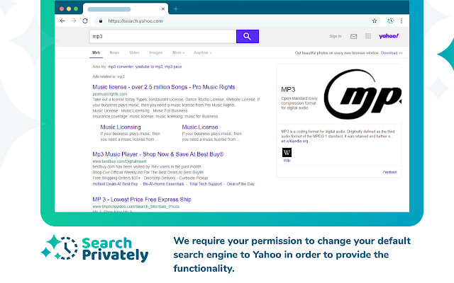 2. 访问“webRequest”、“webRequestBlocking”和“webNavigation”。此权限允许我们将您的默认搜索引擎重定向到 Yahoo 以提供此扩展程序的功能。如果您不喜欢此更改,则需要从浏览器中卸载此扩展程序。您可以随时通过关闭此扩展控制面板中的切换按钮来禁用扩展状态。