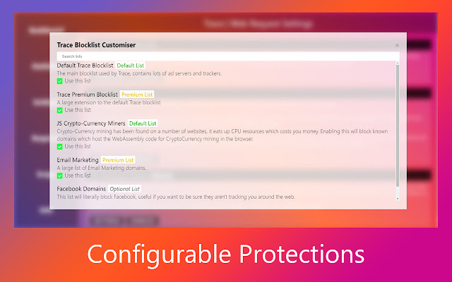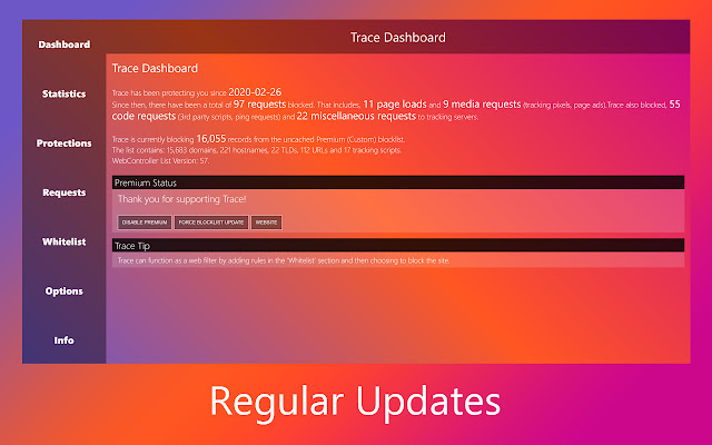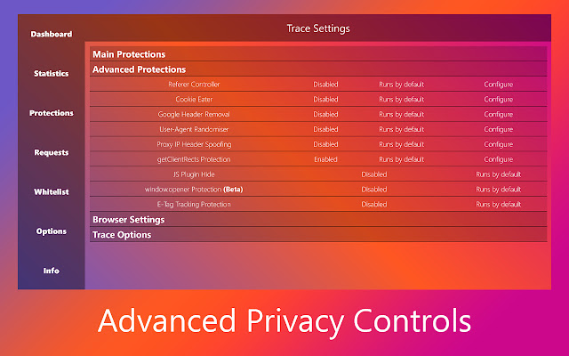 Trace 是我在业余时间制作的一个扩展程序,用于停止在线跟踪并让用户更好地控制可能很难找到的浏览器功能,或者在其他情况下启用而没有禁用选项。 Trace 背后没有开发团队,我自己写的,所以你可以确定它背后没有邪恶的公司试图获取你的数据。