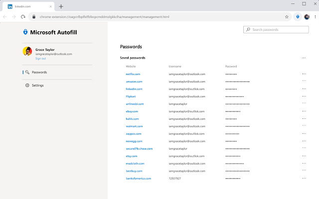 此扩展程序适用于 Google Chrome 浏览器。如果使用的是 Microsoft Edge,则已具有 Microsoft 自动填充功能 - 只需转到“设置”等 (…) >“设置”>“配置文件”>“密码”。