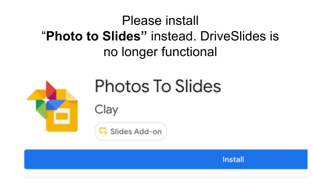 不幸的是 DriveSlides 不再可用。请使用 G Suite Marketplace 中的 Photo to Slides Add-on https://gsuite.google.com/marketplace/app/photos_to_slides/647697115592