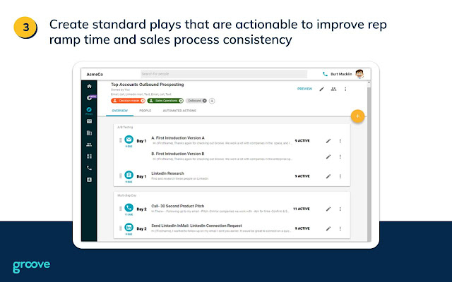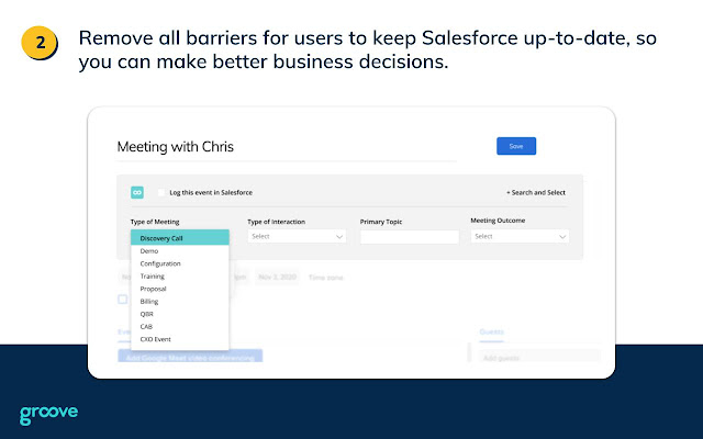 Groove 是使用 Salesforce 的企业的领先销售参与平台,专注于易用性、易于管理和跨团队协作。 Groove 专为满足全周期卖家的需求而设计,可将非销售活动自动化,以便销售代表和售后代表可以花更多时间建立关系并产生收入。