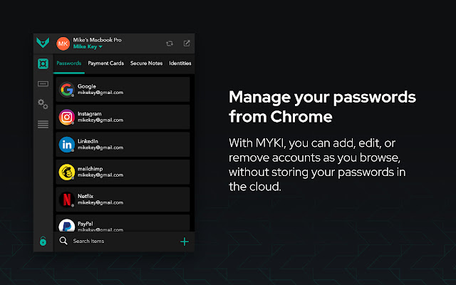 在任何设备上访问您的密码和数据。 MYKI 适用于所有浏览器、移动设备和计算机
