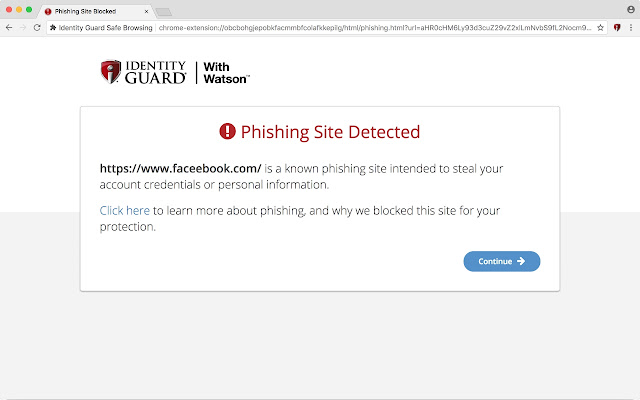- 反网络钓鱼:防止网络钓鱼攻击。 Identity Guard 收集有关最近发现的网络钓鱼站点的信息,并近乎实时地更新您的扩展程序。如果检测到网络钓鱼站点,您将看到一个警告页面,阻止加载恶意站点。
