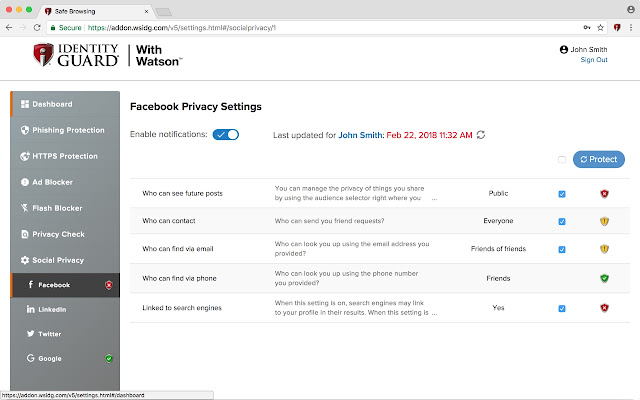 - 社交隐私管理器:今天的社交媒体网站有非常暴露的隐私设置。通常,您不认识的人可以看到您的个人信息、照片和联系人。除了侵犯隐私外,犯罪分子还使用社交媒体来了解他们毫无戒心的受害者。为了解决这个问题,该扩展程序以一种易于理解的方式发送您的社交媒体隐私设置,并提供一键式保护按钮来自动保护您的设置。