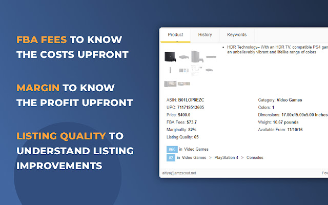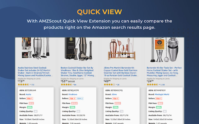 在亚马逊搜索页面上查看保证金,BSR,ASIN,大小等!搜索或浏览产品时,所有关键数据都将可用。此外,无需使用任何工具即可获得独家新闻。