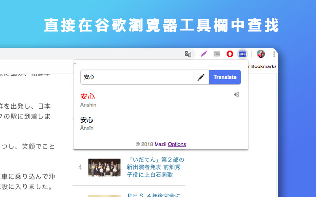 4.要关闭快速翻译,请单击工具栏上的Mazii图标,将出现一个小窗口,单击选项并取消选中“打开快速翻译”。
