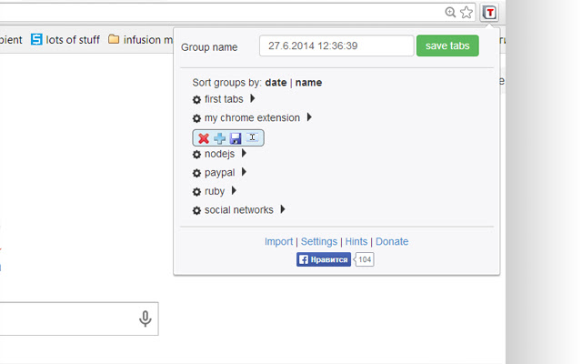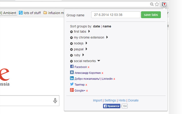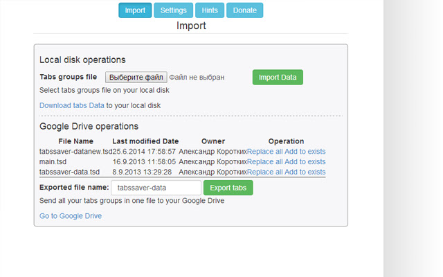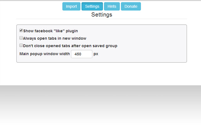 如果您在 Tabs Saver 首选项页面上输入,您可以导出您的标签数据并将其保存在文件中或将其导出到 Google Drive。您也可以禁用 Facebook 的“like”插件并切换打开标签模式。