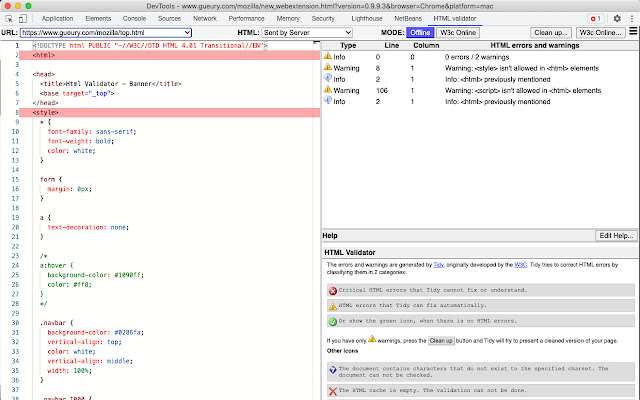 该扩展基于 HTML Tidy。该算法最初由 Web Consortium W3C 开发。该算法嵌入在您的浏览器中,并在您的机器上本地进行验证,而无需将 HTML 发送到第三方服务器。