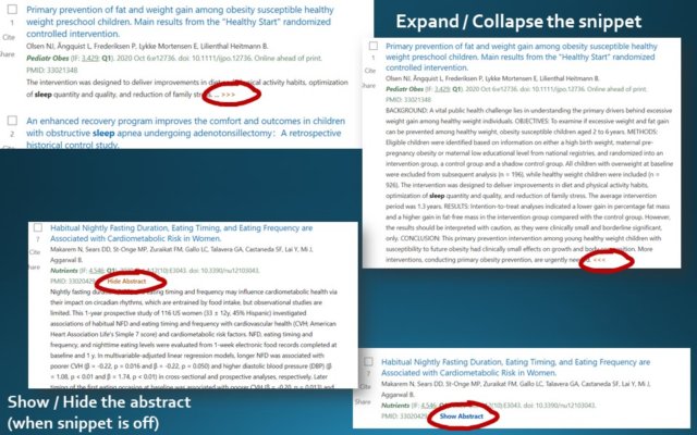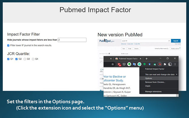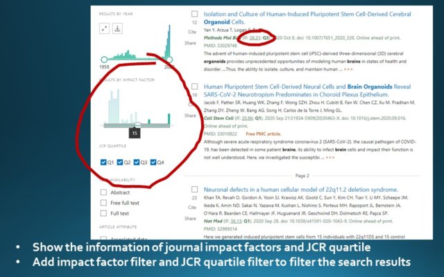 在PubMed网页中显示期刊的影响因子(IF)和JCR四分位信息(Q1-Q4);按影响因子或期刊的JCR四分位数过滤搜索结果;展开或折叠片段;显示或隐藏摘要。