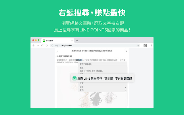 5. 右键快速搜寻回馈商品:选取文字按右键,马上搜寻/比价享有LINE POINTS回馈的商品。