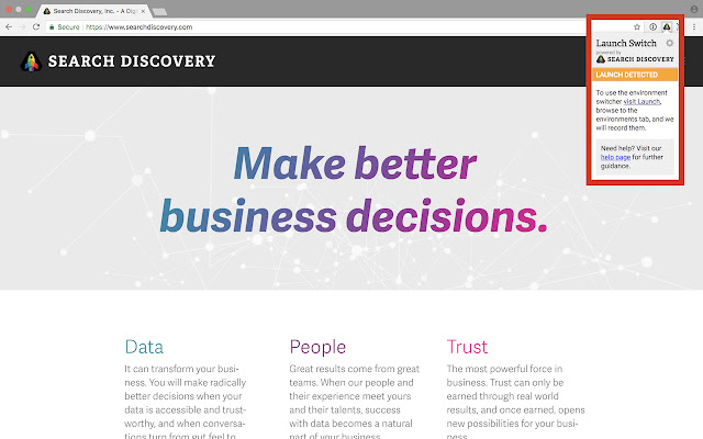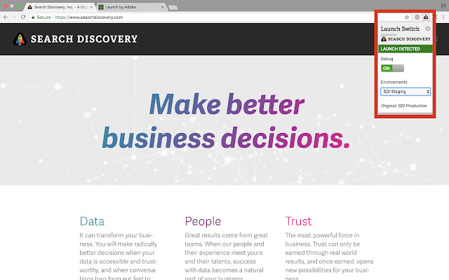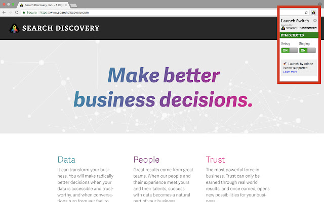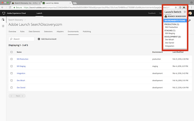 Search Discovery 分析团队的这个方便的扩展允许您为 Adobe Launch 选择环境,并为 Adobe Dynamic Tag Management 切换调试和暂存模式。调试模式告诉 DTM 或 Launch 库将应用程序消息添加到控制台。 DTM 的暂存模式使用暂存库而不是生产库。对于使用 Adobe Launch 的站点,该开关允许在属性内轻松切换环境。