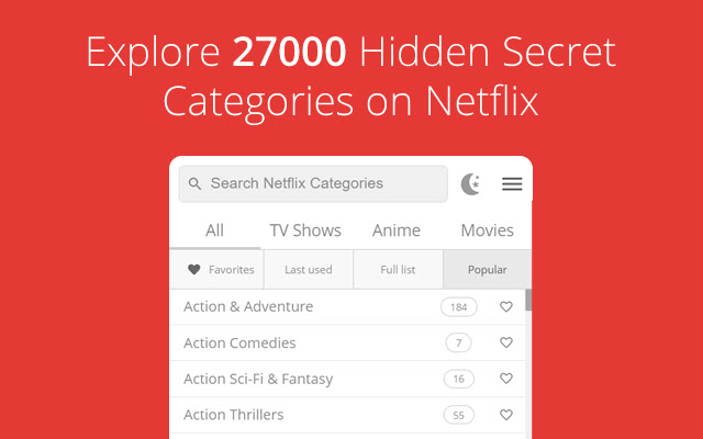 免费版包括 208 个最受欢迎的类别。您可以一键免费升级扩展程序,解锁所有 27000 个隐藏的 Netflix 秘密类别。获取所有 Netflix 机密类别的完整列表,找到更多您真正喜欢的节目和电影!