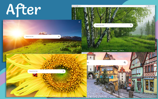 Charming Tab 用漂亮的随机风景图片替换了标准背景。通过添加图像以您想要的方式自定义它。使用 Charming Tab 将您的常规起始页变成漂亮的。扩展可以改变你的新标签搜索。单击“添加到 chrome”,即表示我接受并同意安装“迷人标签”Chrome 扩展程序并将 Chrome™ 新标签搜索设置为服务以及使用条款和隐私政策提供的搜索。