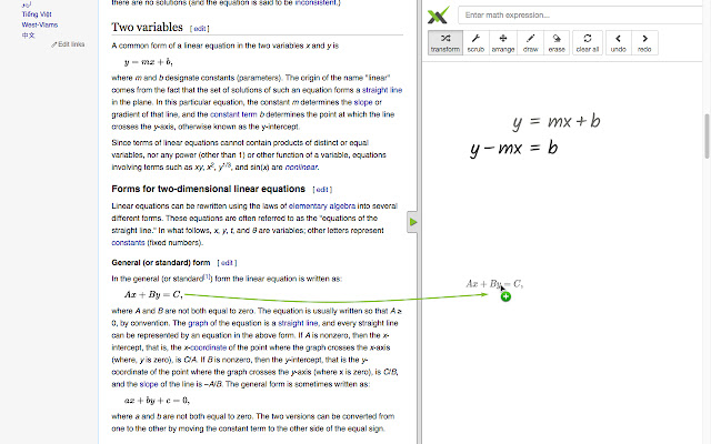 使用此扩展程序打开侧边栏,可让您处理页面上的任何代数。将公式拖放到侧边栏中或直接输入后,您就可以与术语交互以创建代数推导。从维基百科以外的其他页面拖放可能会也可能不会。联系我们为您最喜欢的页面添加支持!