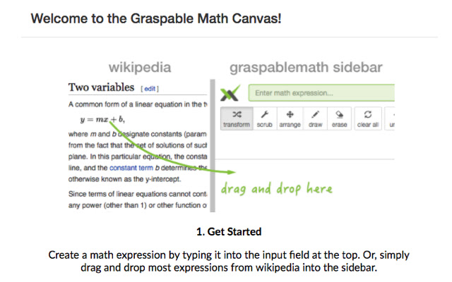 在 https://graspablemath.com/canvas 或此侧边栏扩展中使用我们的全尺寸应用程序。两者都允许您将大多数静态数学表达式从 Wikipedia 或许多其他页面拖到画布上以使其具有交互性。