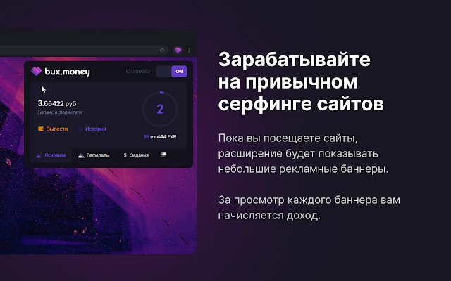 该扩展程序在其他网站的顶部显示小广告横幅,供查看您赚钱的网站。提现1卢布至Qiwi、Payeer、YuMoney等钱包。