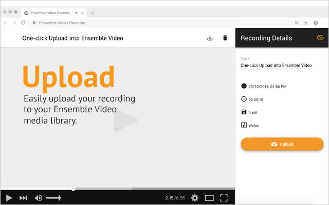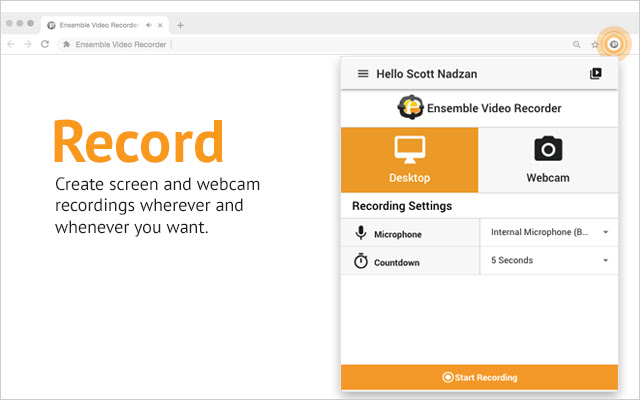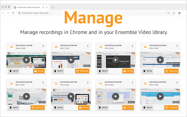 使用 Chrome 浏览器在任何计算机上轻松创建屏幕和网络摄像头录音。然后使用 Ensemble Video Platform 上传并即时分享您的视频。 Ensemble Video 是一个统包式视频平台,可简化视频采集、视频管理和视频发布。 Ensemble Video 使全球数百个先进组织能够随时通过各种网络提供可访问的媒体内容。