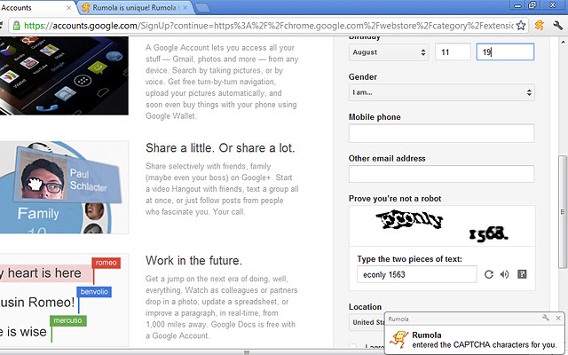 Rumola 是一个新的应用程序。它消除了 CAPTCHA 测试中的猜测。 Rumola 会阅读字母和数字,并为您将它们放入盒子中。下载 Rumola 进行免费测试 — 您可以运行 Rumola 5 次以证明其有效。如果您感到满意,帐户中的第一笔 0.99 美元/1.95 美元将为您购买 50/150 积分,其中一个积分 = 在 CAPTCHA 框中输入一次。此后,根据需要购买积分。