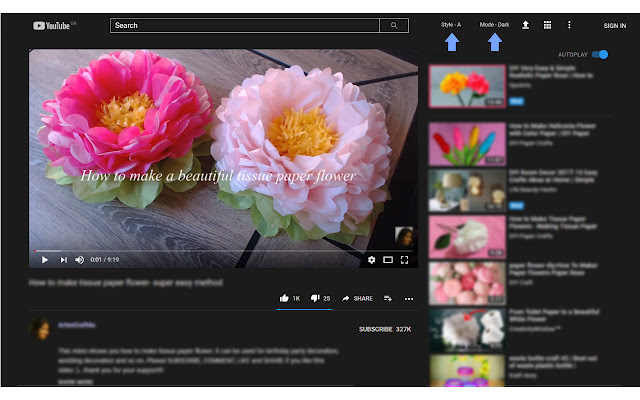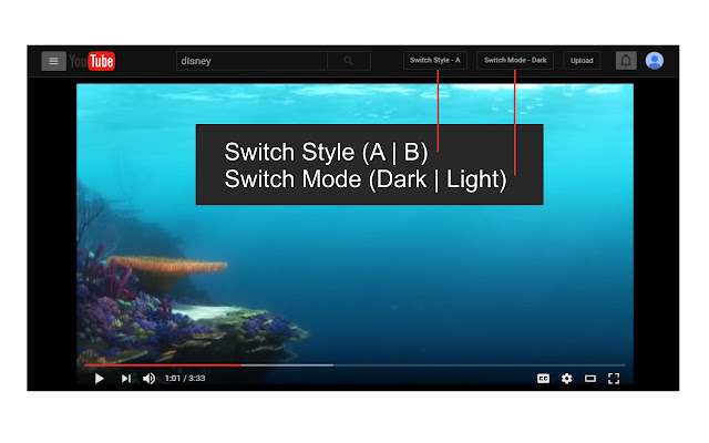 d.该插件有两个黑暗主题。主题 (A) 使用标准 CSS 技术使 YouTube 页面变暗。主题 (B) 使用 CSS 过滤器来完成这项工作。 (使用页内按钮在这两个主题之间切换)。
