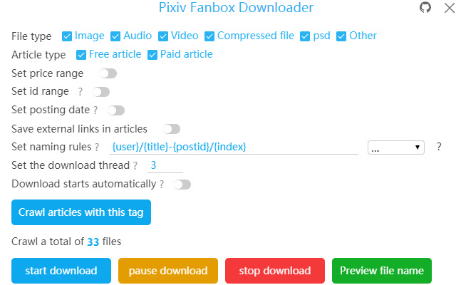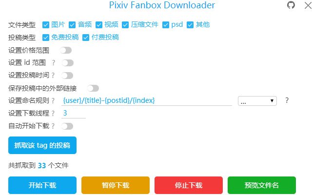 Batch downloading files on Pixiv Fanbox.Supports filtering file types, custom file names, and multiple languages.