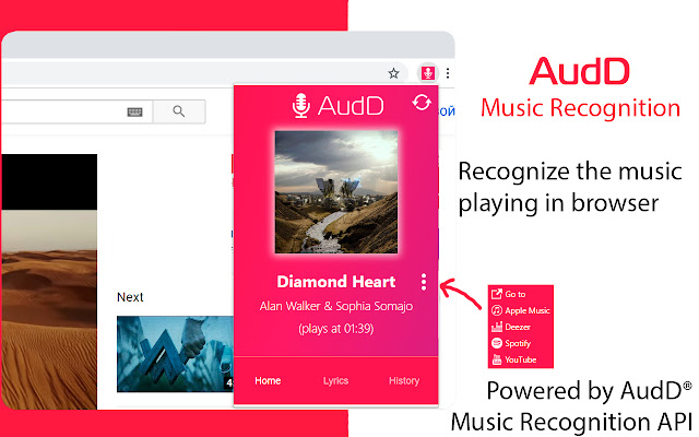 安装 AudD 扩展并单击其图标以识别当前选项卡上正在播放的歌曲。