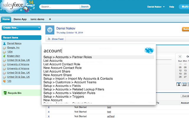 - 所有设置链接都可用 -- 输入“设置”以查看所有内容。例如,如果您想进入帐户字段设置,请输入“帐户字段”。或任何自定义对象设置页面,键入“setup