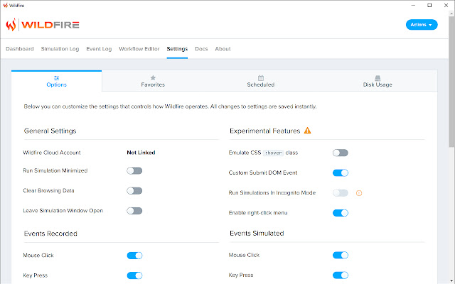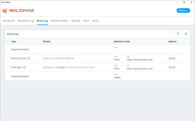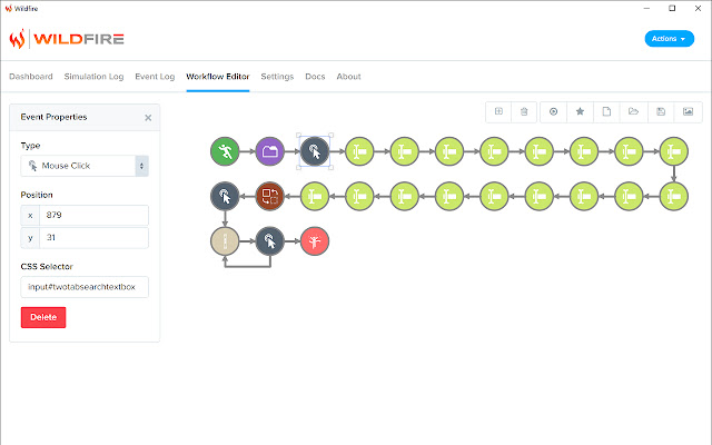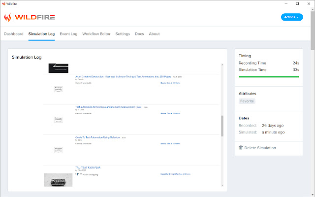 Wildfire 扩展允许您在访问的页面上记录您的操作,然后使用模拟器重播这些操作。当记录或模拟操作时,它会生成一个可以查看的日志。然后,您可以使用工作流编辑器来操纵模拟的行为。