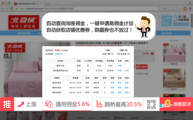 老牌淘宝客插件,创立于2015年,成立至今安装量已过百万!淘客助手插件提供全网商品佣金、隐藏优惠券查询,推广数据统计分析,自动申请高佣金计划等功能。官网:www.taokezhushou.com