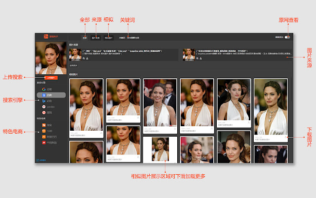 搜图助手是一款支持多引擎搜锁相似图片的浏览器插件,集成了google,百度,yandex,bing等搜索引擎,用户可以不用反复切换搜索引擎以图搜图(search by image),大大提升了搜图的效率;插件的特色是支持电商以图搜图(search by image),可以快速的在电商平台找到相似产品;同时插件还可以一键提取网页所有图片并可以任意选择下载。