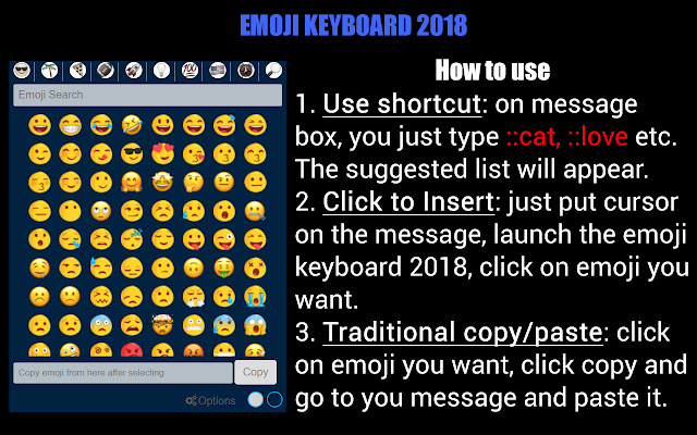 - 此扩展程序为 Chrome 带来了表情符号键盘。您不再需要去表情符号网站搜索、复制表情符号并将其粘贴到您的消息中。现在,您只需安装我们的扩展程序。您可以通过简单的方法选择您想要的表情符号,并将它们用于您的消息、评论等。