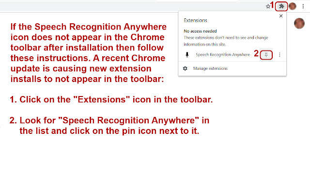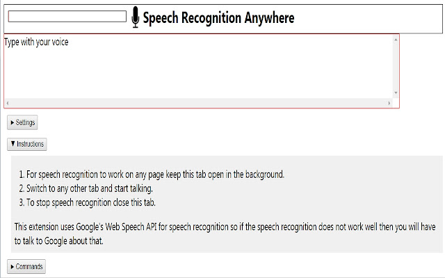 免责声明:Sea Breeze Computers对本产品或服务的性能不作任何保证。 此扩展程序使用Google的Web Speech API进行语音识别,因此我们无法保证语音识别服务的质量或持续运行。