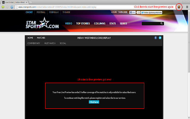 使用此应用程序在 starsports.com 上观看免费比赛,当 10 分钟观看时间结束时单击该应用程序。