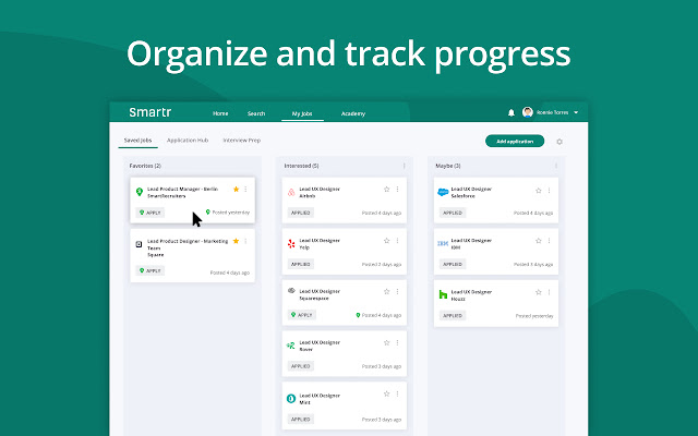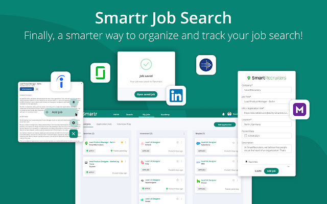 Smartr Job Search 工具允许您从网络上的任何公司页面或工作板“收集”工作。申请工作后,在中央门户中组织和跟踪进度(如果工作由 Smartr 提供支持,还可以享受自动状态更新)!
