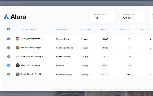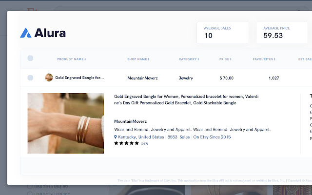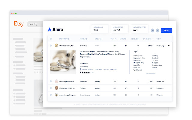 Alura 是加速 Etsy 产品研究的最简单方法。只需单击一下,即可找到有价值的见解,例如估计销售额、价格、浏览量等。