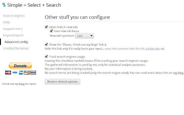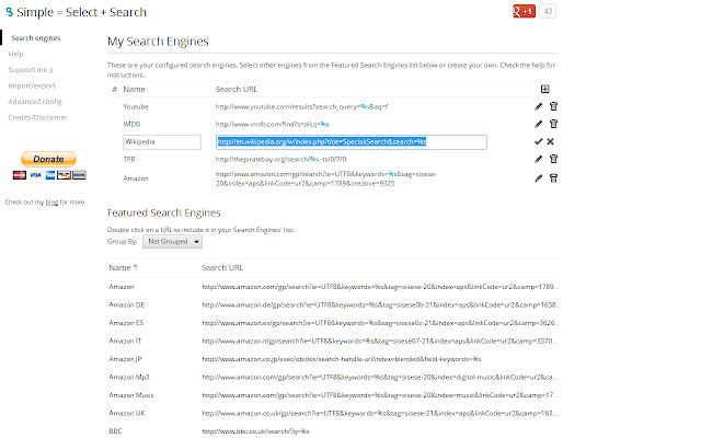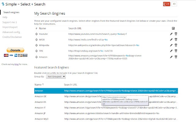 配置您的搜索引擎非常简单:有多个 p 配置的搜索引擎可供选择(如 Amazon、BBC、CNN 等),此外您还可以添加您可能喜欢的任何其他搜索引擎。要添加新的搜索引擎,请按照“选项”页面的“帮助”部分中的说明进行操作。