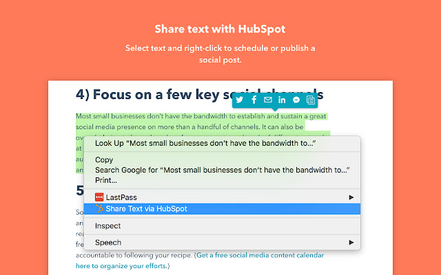 通过单击 Chrome 中的扩展程序图标,草拟和安排帖子以将您当前访问的网页分享到 Twitter、Facebook、LinkedIn、Instagram 等。右键单击任何页面上的文本并选择“通过 HubSpot 共享文本”以将该片段发布到您的社交渠道。