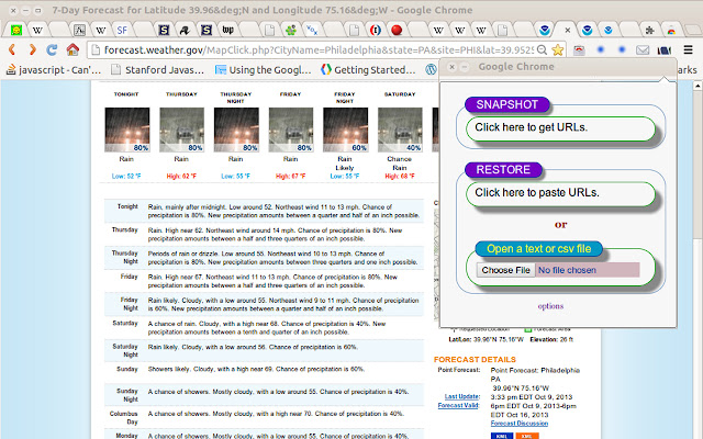 为此,我编写了这个基本扩展来做两件事。第一个是它会生成我当前窗口中打开的所有选项卡的网页标题和 url 的列表。我可以将此列表复制并粘贴到电子邮件中,我可以将其发送给自己,以便稍后在任何使用 Chrome 和此扩展程序的计算机上通过从电子邮件复制并粘贴到扩展程序中来恢复此浏览器会话。或者,我可以通过扩展程序将该列表保存到一个文件中,然后将文件通过电子邮件发送给自己,将其上传到 Dropbox 或 Google Drive 或云中的其他位置,然后在另一台计算机上检索它,然后我可以通过扩展程序将其上传并恢复浏览会话。