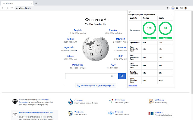 • 需要更多 - 导航到带有选定站点的 Google PageSpeed Insights 站点的超链接