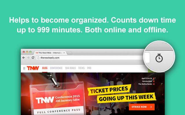 有助于变得有条理。倒计时时间长达 999 分钟。线上线下均可。简单明了的设计。