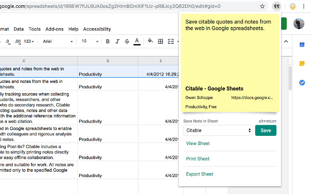 将网络上可引用的引述和注释保存到 Google 电子表格中。