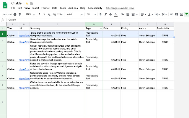 • Spadsheets 存储在名为 Citable 的 Google Drive 文件夹中,但您可以随意重命名它。