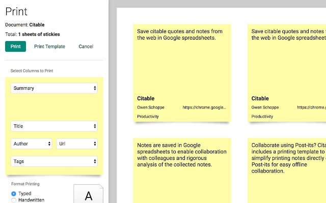 使用便利贴进行协作? Citable 包含一个打印模板,可以简化将笔记直接打印到便签上,以便于离线协作。