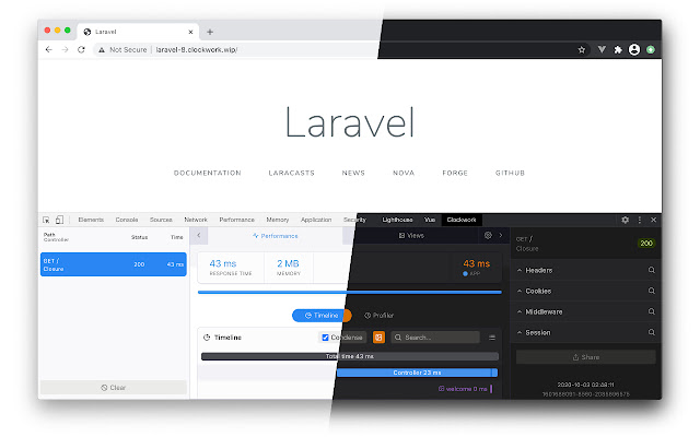 Clockwork 是一款 PHP 开发工具,可直接在您的浏览器中使用。 Clockwork 让您深入了解您的应用程序运行时 - 包括请求数据、性能指标、日志条目、数据库查询、缓存查询、redis 命令、调度事件、排队作业、渲染视图等 - 用于 HTTP 请求、命令、排队作业和测试.