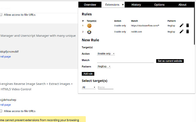 通过二管家,你可以看到每个应用/拓展的详情,不管是它们需要的权限还是它们什么时候更新的。你也可以查看二管家社区给他们打了什么标签,这样你就可以知道它们给不给力。你还可以设置自动规则,这样拓展就只会在你打开特定网页的时候才开启,其他时候都会关闭。