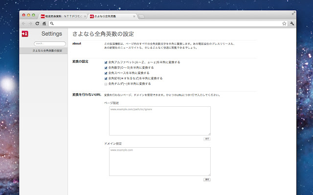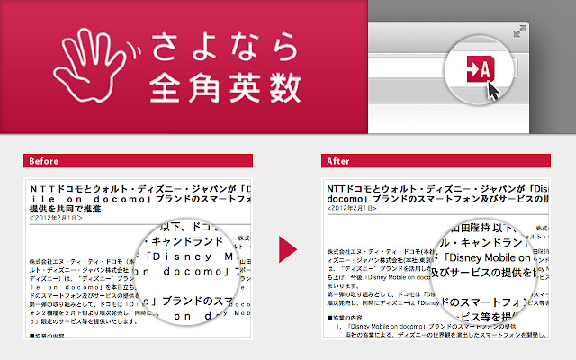 用单字节字符替换页面中的所有双字节字母字符。您将能够轻松浏览该电话公司的新闻稿和该报社的新闻网站,无需任何锐化。