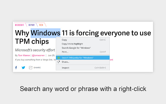此扩展程序为 Web 浏览器添加了 Wikipedia 搜索功能。要执行搜索,只需在浏览器的地址栏中输入“wiki”,然后输入一个空格,然后输入您想要的文章的名称。维基百科的实时建议会在您键入时显示。您还可以突出显示网络上的任何单词或短语,在 Wikipedia 中搜索的选项将出现在上下文菜单中。